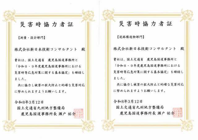 鹿児島国道事務所との災害協定を締結しました。 2026/03/12 地域貢献活動 当社は国土交通省九州地方整備局 鹿児島国道事務所と災害協定を締結いたしました。 当社の技術力と機動力を活かし、地域の安全・安心に貢献してまいります。 投稿ナビゲーション « 鹿児島マラソン2026清掃活動に参加しました。